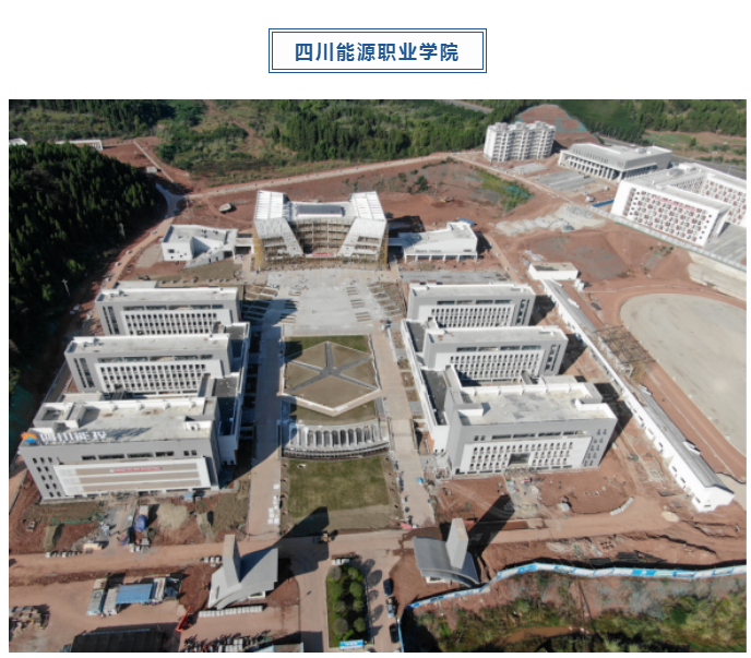 四川能源职业学院占地396亩,建设年限2021-2023年,总投资8亿元。主要建设:主教学楼、行政楼、科技楼、图书馆、田径场看台、体育馆、学生公寓、食堂、教师公寓、双创中心、实训楼、技术与交流中心、实训厂房等。目前,一期主体、砌体完成100%,装饰装修完成100%,安装完成100%,室外总平施工99%,设备设施安装100%,正在进行绿化及收边收口工作。