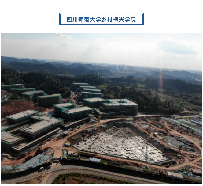 四川师范大学乡村振兴学院占地1040亩,建设年限为2021年-2023年,总投资28.87亿元。主要建设学院楼、图书馆、行政楼、大礼堂、公寓楼等场馆及配套市政、景观道路基础设施。目前,1-11号学生宿舍楼和教师公寓外装完成70%,内装完成30%;三座教学楼抹灰完成100%,外装完成75%,内装完成15%;食堂抹灰完成100%,装修完成5%;后勤楼主体完成100%,砌体完成5%;体育馆基础完成30%;国际交流中心基础施工完成10%;室外总坪管网工程完成50%。预计项目一期将于春节前全面竣工,2023年春季开校招生。