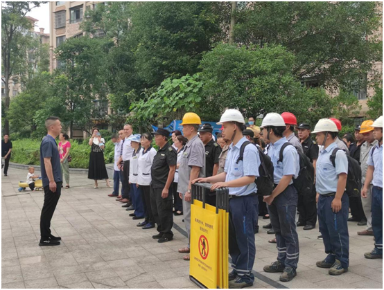 此次演练模拟电梯运行中发生故障停梯,轿厢卡停在两层楼层之间,人员被困电梯中的突发事件。物业管理公司监控中心收到有人员被困的报告后,迅速启动电梯安全专项应急救援预案,采取安抚被困人员情绪、迅速组织现场救援等一系列应急措施,及时救出被困人员。