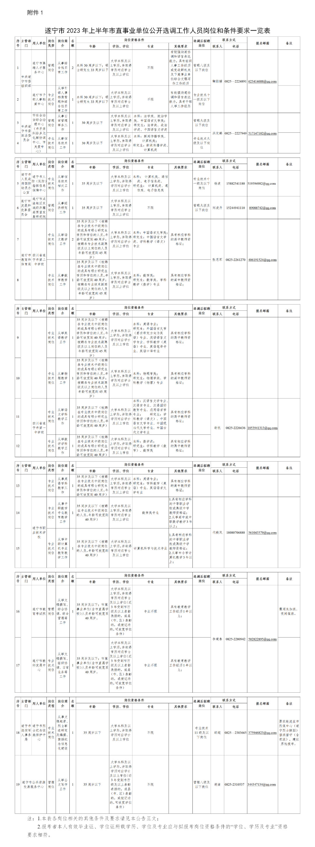 本次公开选调涉及市直12家事业单位19个岗位(共选调工作人员21名),具体选调条件要求详见《遂宁市2023年上半年市直事业单位公开选调工作人员岗位和条件要求一览表》(附件1,以下简称《岗位和条件要求一览表》)。