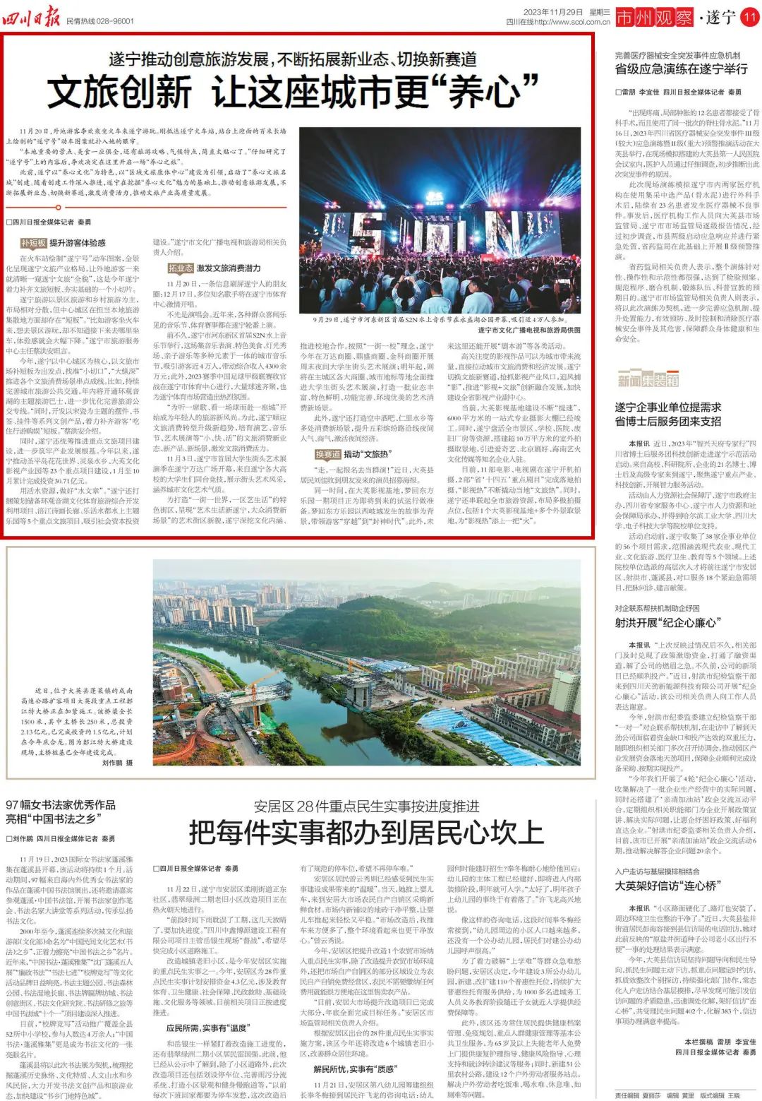 此前,遂宁以“养心文化”为特色,以“区域文旅康体中心”建设为引领,启动了“养心文旅名城”创建。随着创建工作深入推进,遂宁在挖掘“养心文化”魅力的基础上,推动创意旅游发展,不断拓展新业态、切换新赛道,激发消费活力,推动文旅产业高质量发展。