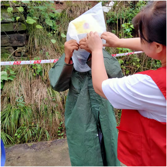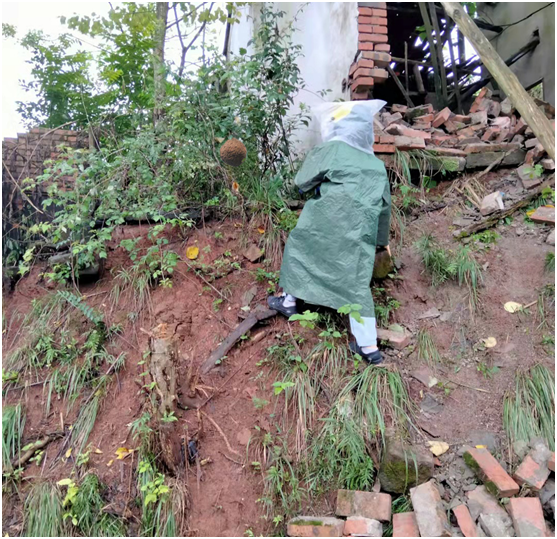 科教园立即联系有经验的工作人员陶茂辉戴上头盔,穿好防护服,戴上手套,全副武装,并准备好麻袋小心翼翼地接近蜂巢,十分熟练地将整个蜂窝成功摘下,并装入麻袋中,接着,工作人员用准备好的杀虫剂进行驱散。仅用了几分钟时间,便彻底清除了蜂窝,消除了安全隐患。群众都拍手称好,谢朝树说:“现在再也不用担心会被突然蜇到,感谢政府我们办了一件好事”。