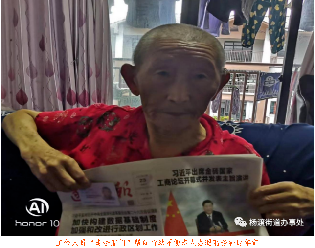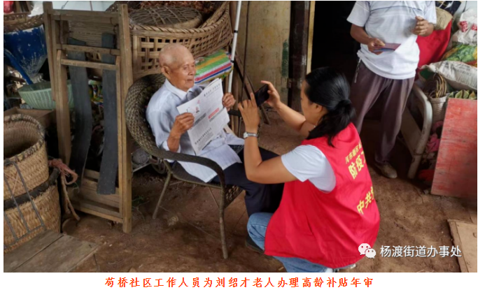 杨渡街道认真摸排辖区高龄老人基本情况,精准核查高龄老人的身份、年龄、是否真正领取高龄补贴,动态更新基本信息,做到情况清、底数明,确保不漏户、不漏人,让党的好政策惠及每一名高龄老人。