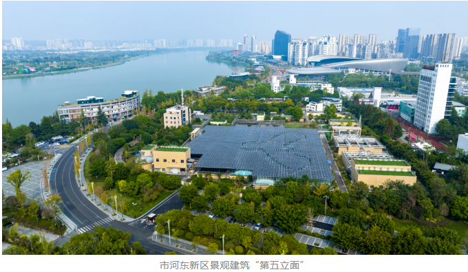 城市风貌彩绘、休闲景观空间、光伏发电板……站在市河东新区临仙阁上俯瞰城区,建筑物楼顶整洁有序,城市立面赏心悦目。