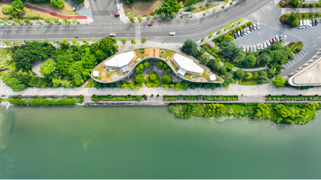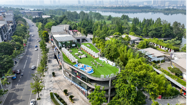 五彩缤纷路上的梅希夫人是最早进行“第五立面”改造的商户之一。餐厅屋顶进行了景观空间设计,葱茏的绿植、景观小品增加趣味性,一侧布置有桌椅,抬眼远望,涪江美景尽在眼前。