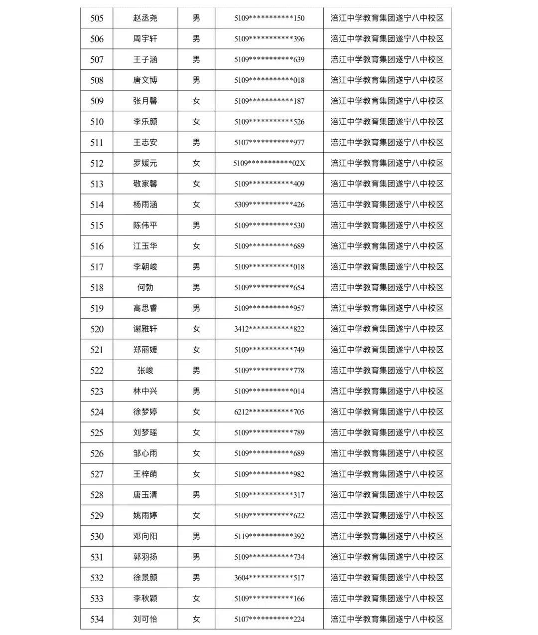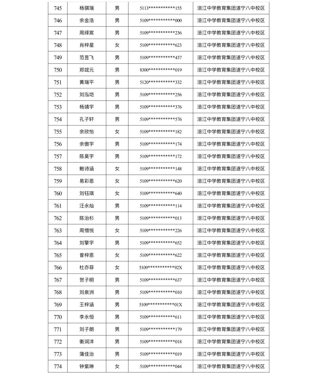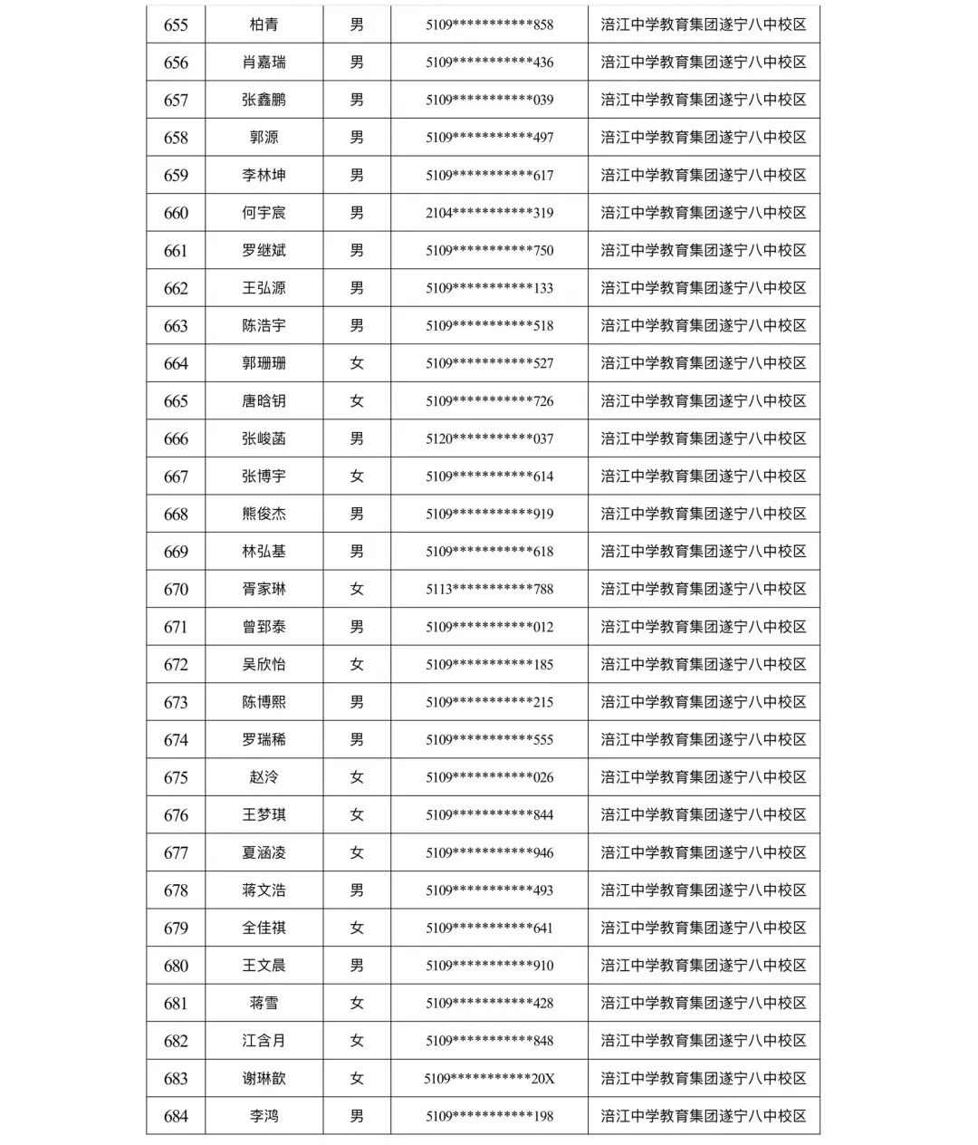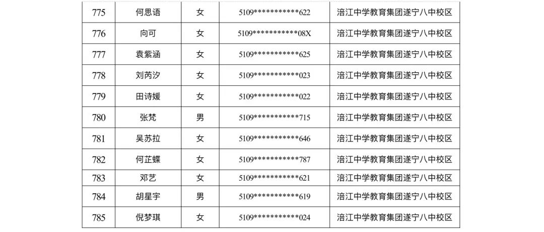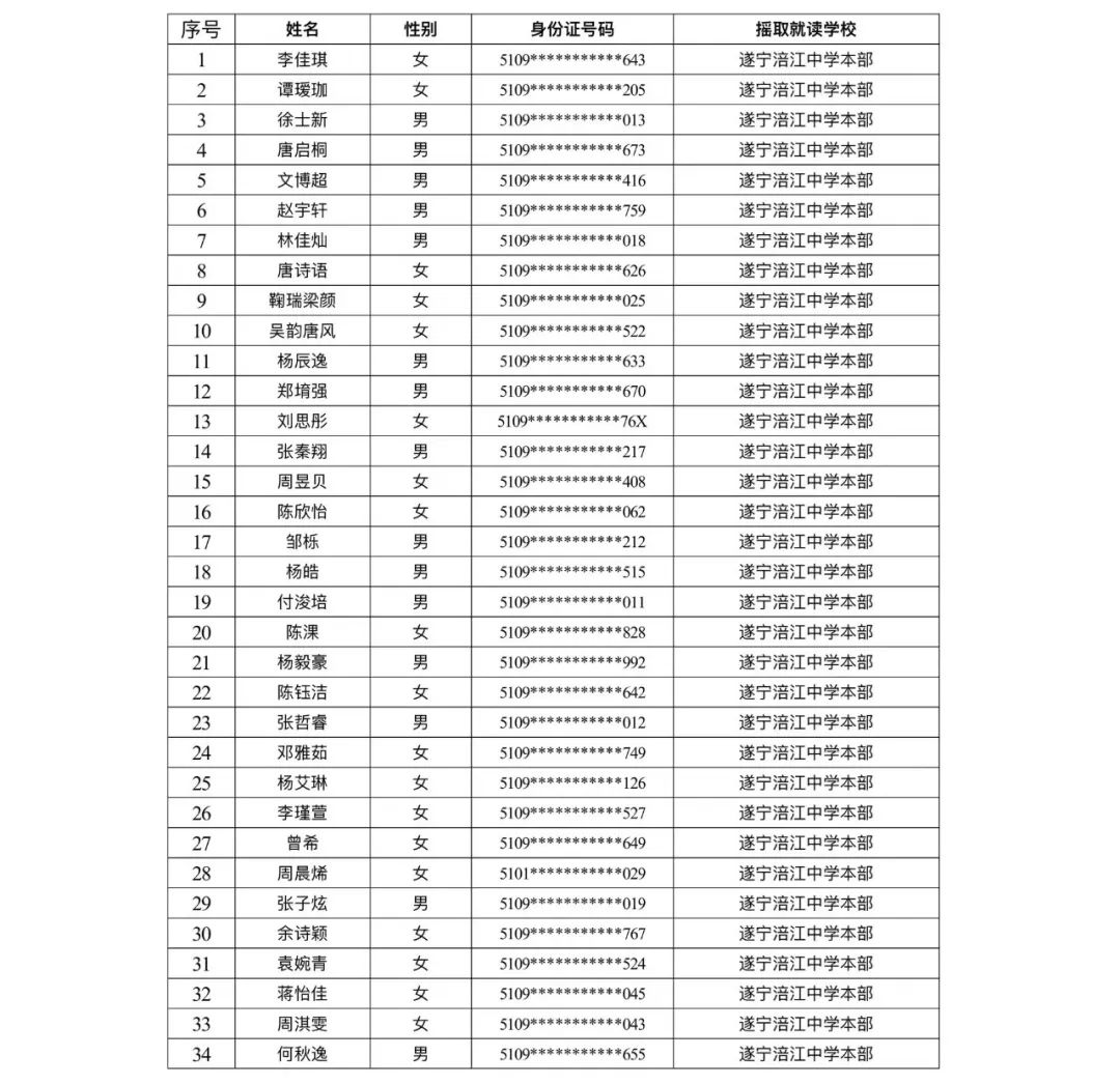 遂宁涪江中学教育集团2023年秋季学期河东片区初一新生摇号结果