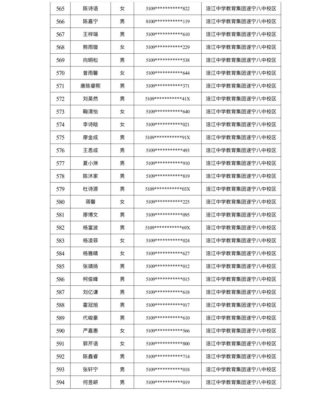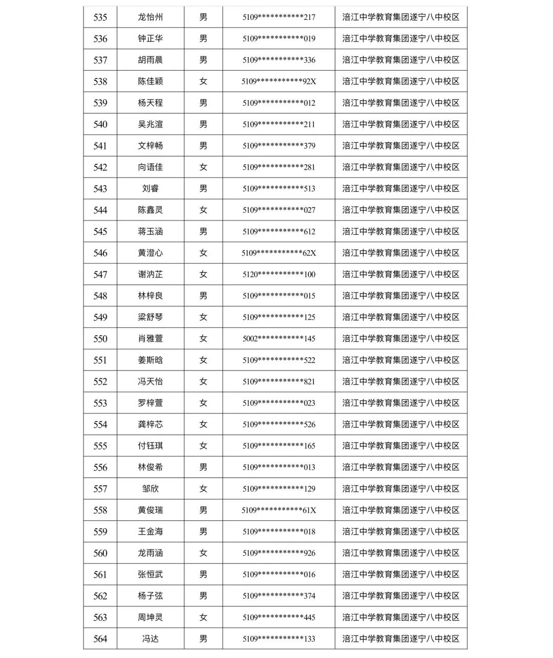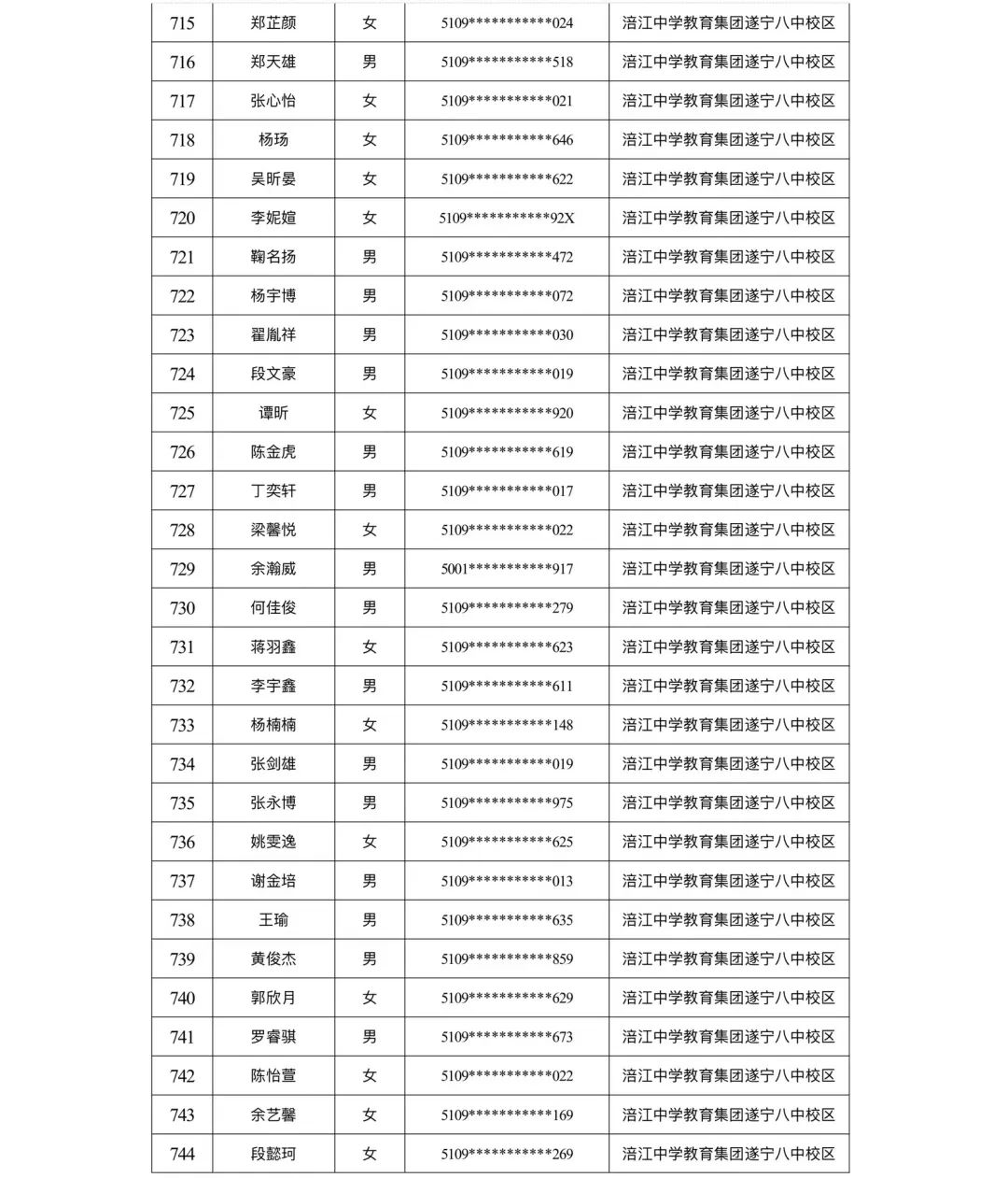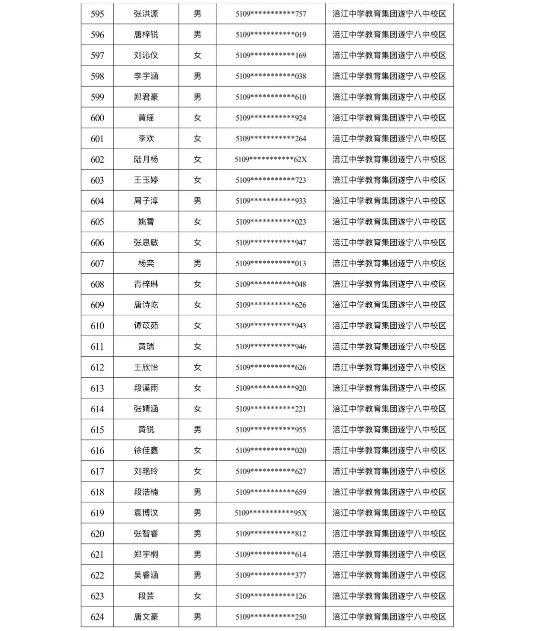 遂宁涪江中学教育集团2023年秋季学期河东片区初一新生摇号结果