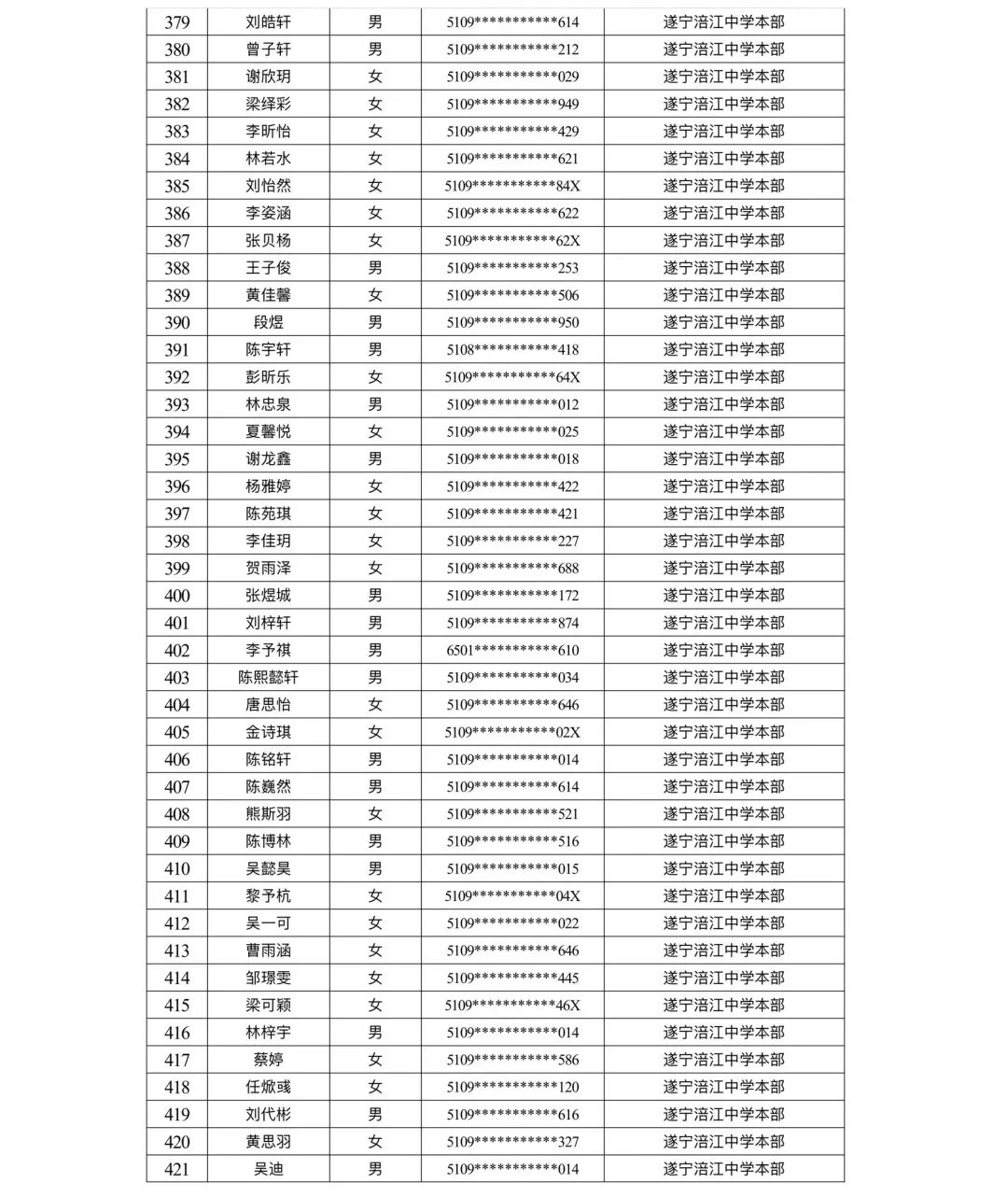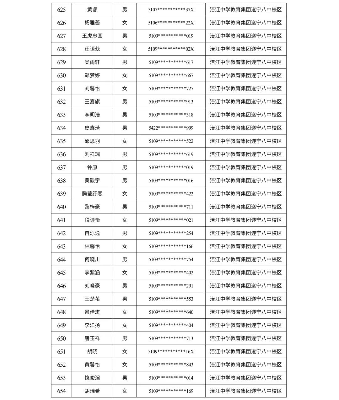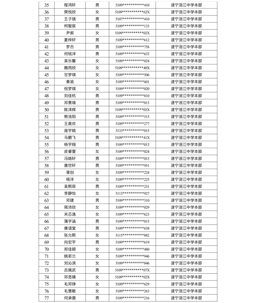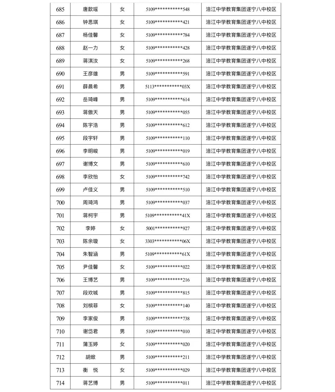 遂宁涪江中学教育集团2023年秋季学期河东片区初一新生摇号结果