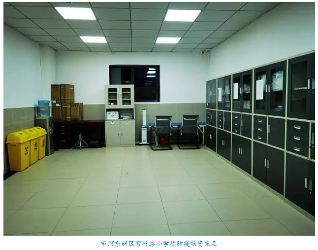 在市河东新区紫竹路小学校,记者看见学校防疫物资充足,备有口罩6000余个,一次性防护服40件,消毒液82瓶,额温枪85支,酒精241瓶,免洗手液69瓶。此外,学校还备有防护面罩、一次性头套等防疫物资。