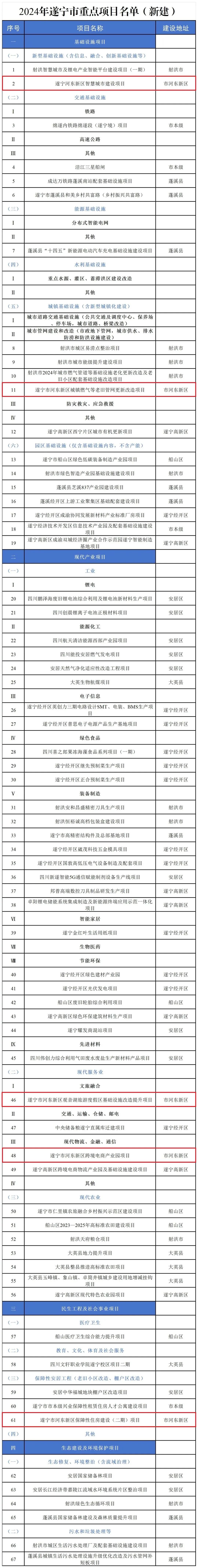 近日,我市发布《2024年遂宁市重点项目名单》,计划实施市重点项目200个,计划总投资3001.9亿元、年度计划投资637.5亿元。其中续建项目133个、年度计划投资475.4亿元;新建项目67个、年度计划投资162.1亿元。