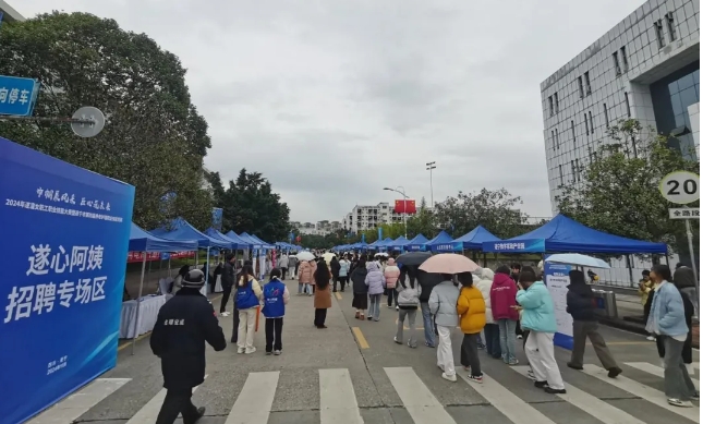 此次校招活动是结合2024年遂潼女职工职业技能大赛暨遂宁市第四届养老护理职业技能大赛契机,由遂宁市人社局、农民工服务中心主办,新区人社中心承办,旨在进一步推动高校毕业生就业工作,提升就业服务水平,为企业和毕业生搭建一个供需对接的桥梁。活动中,以数字家政产业为主的20余家家政养老机构及生产制造、金融保险、酒店餐饮、数字媒体、物业、培训等领域用人单位45家企业设立招聘展位,提供月嫂、养老福利、家政保姆、清洁师、整理归纳师、收银、迎宾、服务员、前台、店长、营业员、文员、客服、教师、自媒体专员、运营等岗位2200余个,为毕业生们提供丰富多样的岗位选择。活动现场氛围热烈而有序,校内学生穿梭于各个展位之间,积极与企业招聘人员沟通交流,了解岗位需求、薪资待遇、晋升空间等关键信息。企业招聘人员也热情向学生们介绍企业文化、发展前景以及招聘流程,并耐心解答他们的疑问。